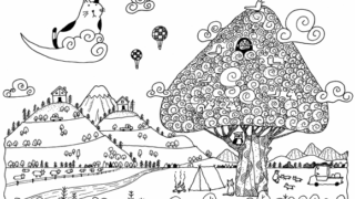 イラスト ダルマさんが見ていた!(樹木シリーズ04) 自分が好きなデイブ・ガーボットの世界を拝借したイラスト。ダルマさんが木のなかに隠れて周りの様子をみている。雲に乗ったニャンコがあらわれたので、何が始まるかな? 2025.07.01 イラスト